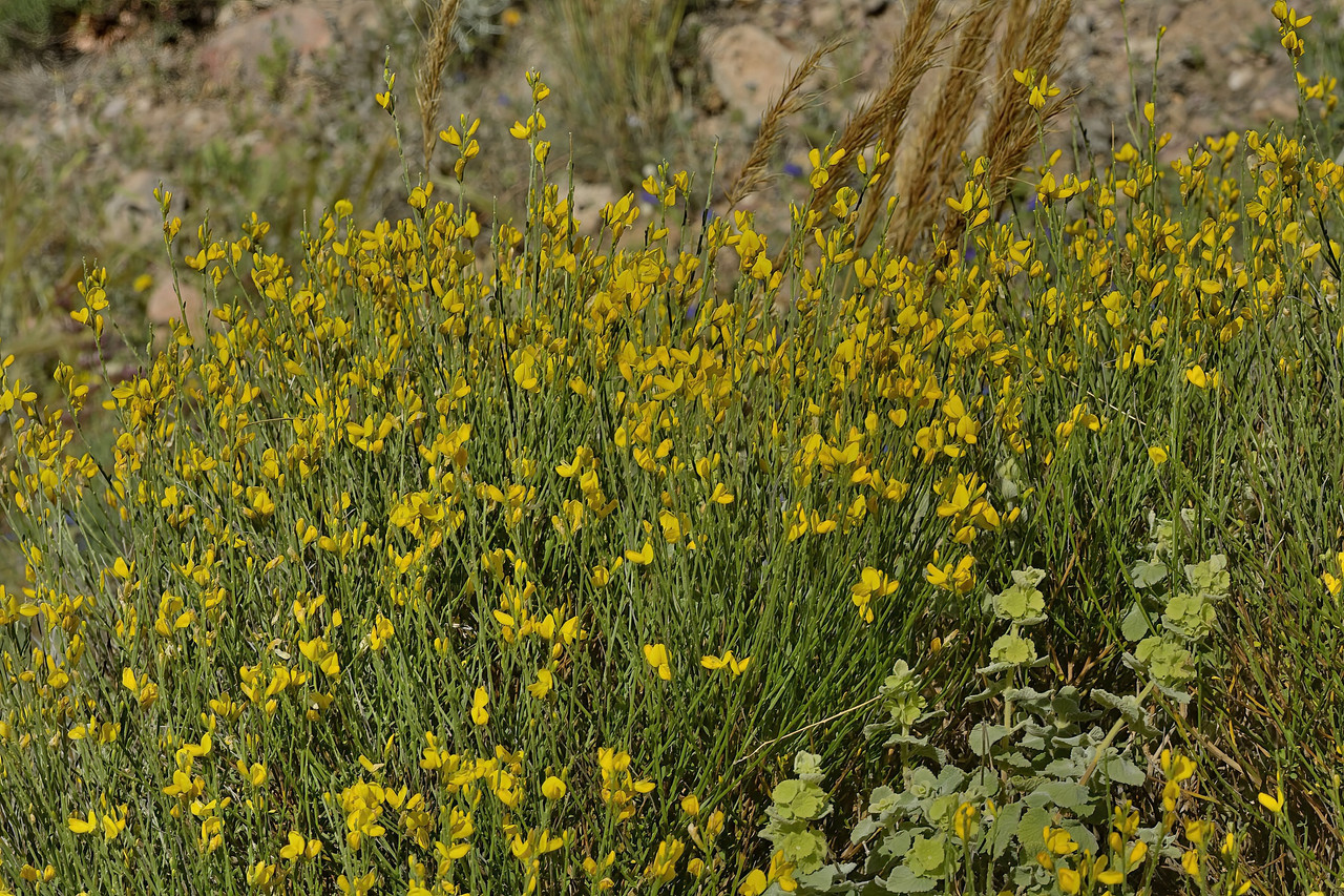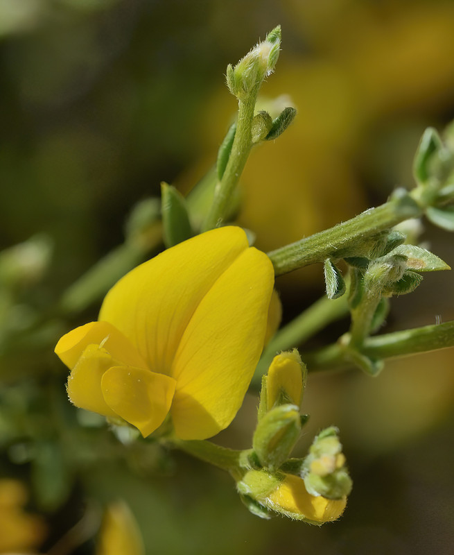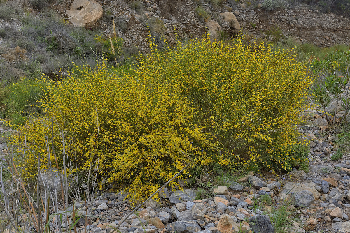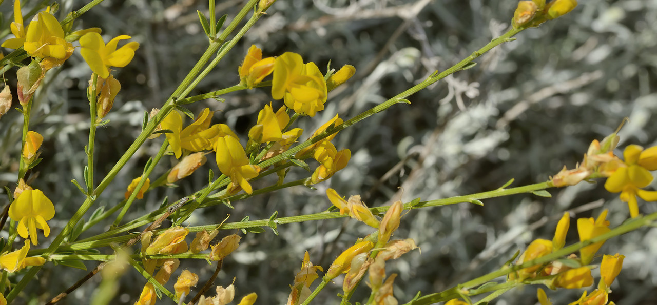 Tal como as duas plantas anteriores, esta giesta, de seu nome Genista spartioides, não existe em Portugal, embora não nos faltem giestas de aspecto semelhante. Uma delas é a G. cinerascens, que ocorre em Trás-os-Montes e na Beira Alta: é também uma giesta sem espinhos, de porte não muito elevado (fica-se pelo metro de altura), com caules profundamente estriados. É instrutivo notar, porém, que a G. cinerascens tem folhas persistentes, presentes em simultâneo com as flores, enquanto que as folhas da G. spartioides são muito fugazes, em geral ausentes aquando da floração. Além disso, e como se observa na última foto acima, as flores da G. spartioides têm uma quilha muito saliente, que por vezes quase duplica o comprimento das asas. Esta última característica permite facilmente destrinçar a G. spartioides de congéneres suas que ocupam habitats semelhantes na província de Almeria. Sirva de exemplo uma quase sósia da G. cinerascens, a G. jimenezii, ilustrada abaixo com fotos obtidas no Cabo de Gata.