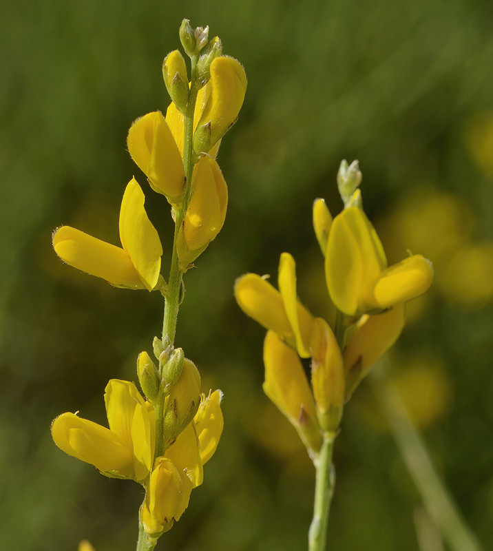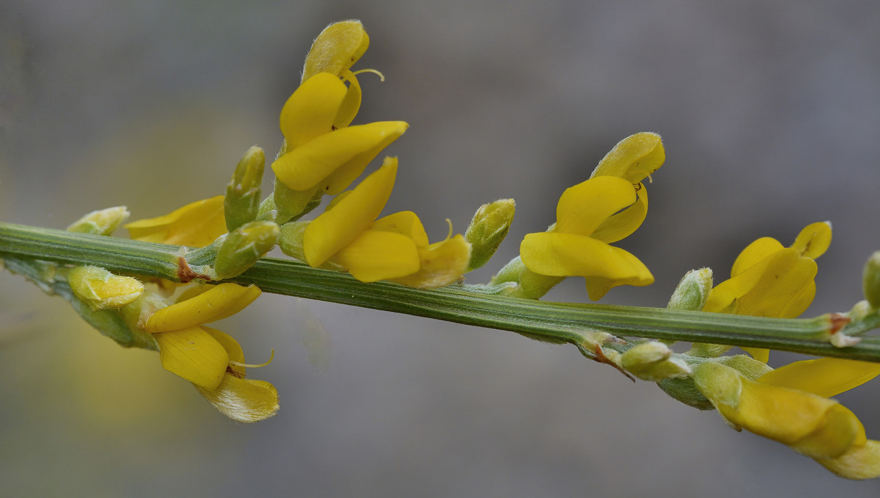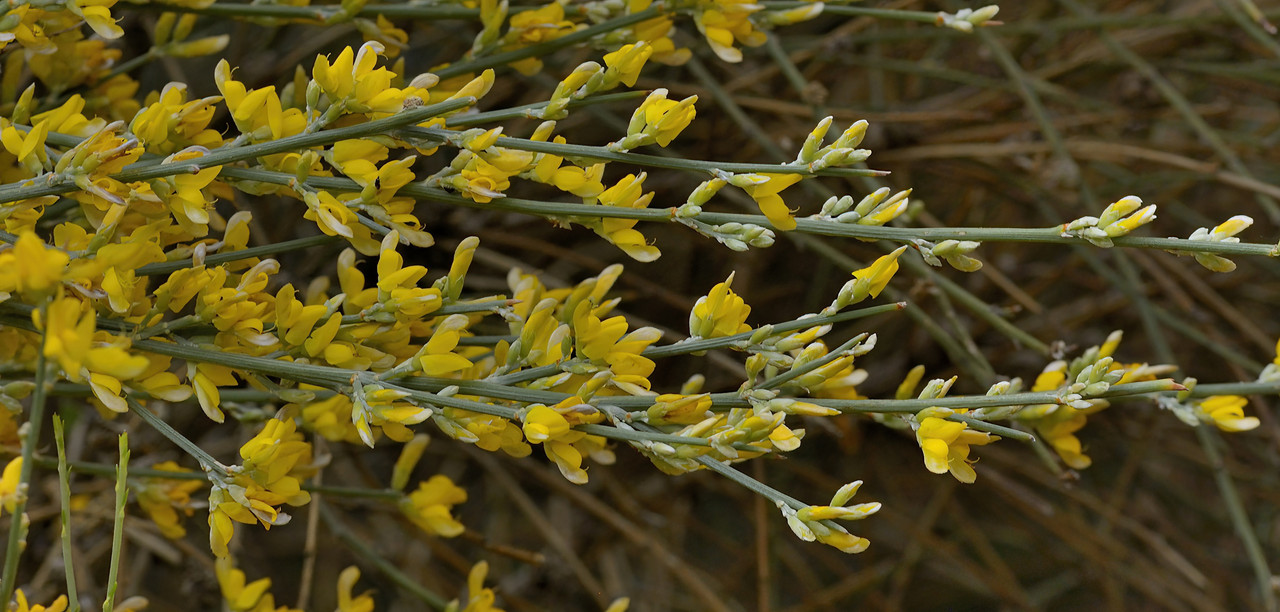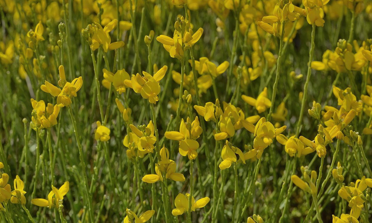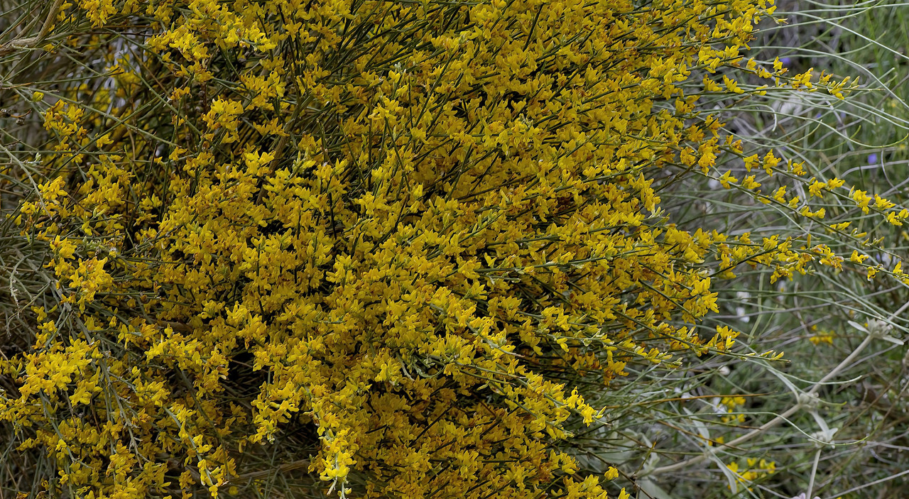 Tal como as duas plantas anteriores, esta giesta, de seu nome Genista spartioides, não existe em Portugal, embora não nos faltem giestas de aspecto semelhante. Uma delas é a G. cinerascens, que ocorre em Trás-os-Montes e na Beira Alta: é também uma giesta sem espinhos, de porte não muito elevado (fica-se pelo metro de altura), com caules profundamente estriados. É instrutivo notar, porém, que a G. cinerascens tem folhas persistentes, presentes em simultâneo com as flores, enquanto que as folhas da G. spartioides são muito fugazes, em geral ausentes aquando da floração. Além disso, e como se observa na última foto acima, as flores da G. spartioides têm uma quilha muito saliente, que por vezes quase duplica o comprimento das asas. Esta última característica permite facilmente destrinçar a G. spartioides de congéneres suas que ocupam habitats semelhantes na província de Almeria. Sirva de exemplo uma quase sósia da G. cinerascens, a G. jimenezii, ilustrada abaixo com fotos obtidas no Cabo de Gata.