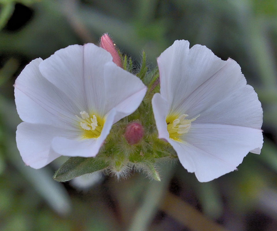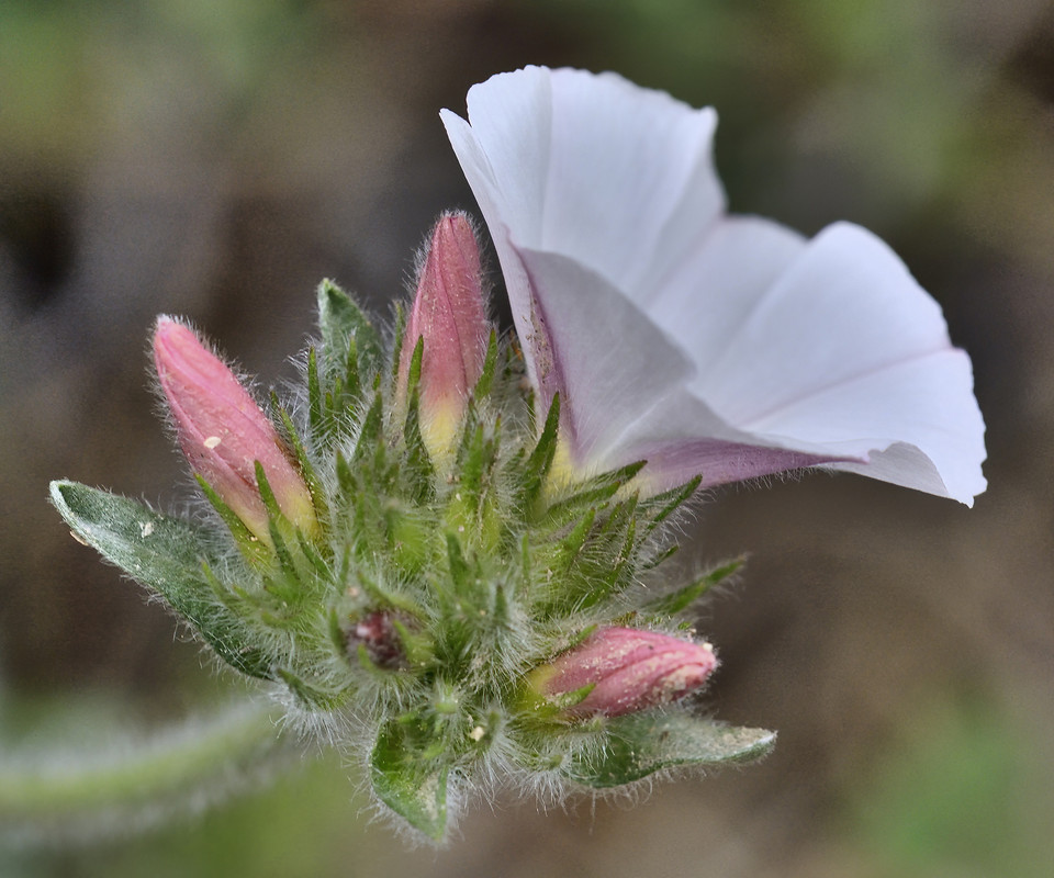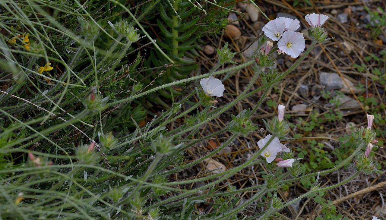 Vulgarmente conhecidas como corriolas, as plantas do género Convolvulus e de outros géneros aparentados (como Ipomoea e Calystegia) reconhecem-se pelas flores em forma de trombeta, sem pétalas individualizadas. Muitas delas são herbáceas anuais, sendo esse o caso da espécie mais comum em Portugal, Convolvulus arvensis, e de várias outras que surgem sobretudo na metade sul do país: C. tricolor, C. siculus, C. meonanthus e C. humilis. Em contraste com estas temos as espécies lenhosas, de que a maioria vive nas ilhas da Macaronésia (exemplos aqui e aqui) mas contando-se entre as excepções o Convovulus fernandesii, endemismo da serra da Arrábida. O Convolvulus lanuginosus, que acima ilustramos, situa-se entre estes dois extremos por ser uma herbácea perene de base lenhosa. Os caules, erectos ou prostrados, densamente penugentos, atingem os 60 cm de comprimento, as folhas são lineares e sésseis, e as flores, de um cor-de-rosa pálido, têm uns 3 cm de diâmetro. Ausente de Portugal, distribui-se pela costa mediterrânica de Espanha, sul de França e Marrocos.