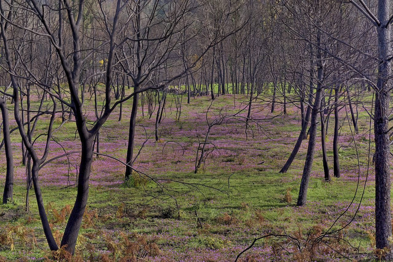 A paisagem destruída é casa de gente, bichos e plantas. Das cinzas que amortalharam os prados, entre negros esqueletos de árvores que nem para lenha vão servir, desponta um colorido tenaz (verde, amarelo, rosa) com a força de uma promessa que se cumpre. Ainda não é a Primavera, pois no Inverno também há flores, mas é a certeza de que a vida segue o seu curso. Mesmo a falsa Primavera das acácias, mais deprimente (porque irremediável) do que um bosque queimado, abre aqui e ali, no amarelo sufocante, brechas onde se refugiam outras cores. É desses lugares que poderiam ser de desistência que nos chegam as plantas-guerreiras com que ilustramos o texto de hoje. Em Mareco (Penalva do Castelo), seis meses após os grandes incêndios do Verão de 2024, os bicos-de-cegonha (Erodium cicutarium) floriam desvairadamente, cobrindo com festiva manta cor-de-rosa o solo enegrecido. E na orla de um desses campos vimos um lâmio que nos foi causa de regozijo: não se distinguindo ele dos seus congéneres ruderais mais comuns pela formosura ou pelas exigências ecológicas peculiares, tratava-se afinal de um discreto endemismo lusitano, restrito à zona centro do país. Para completar a agenda desse 1 de Março, faltava-nos descer ao Mondego para um encontro com o Narcissus scaberulus. As margens do rio junto à ponte de Ribamondego são um pesadelo: acácias e mais acácias, nada senão acácias e o seu cheiro adocicadamente enjoativo. Mas os narcisos responderam à chamada, e empoleirado num penedo esperava-nos um outro lâmio, esse de flor branca, para nós também inédito.