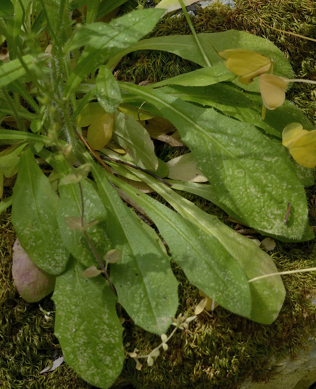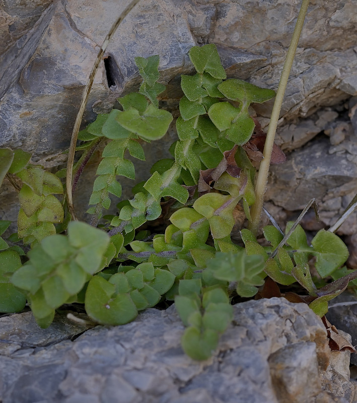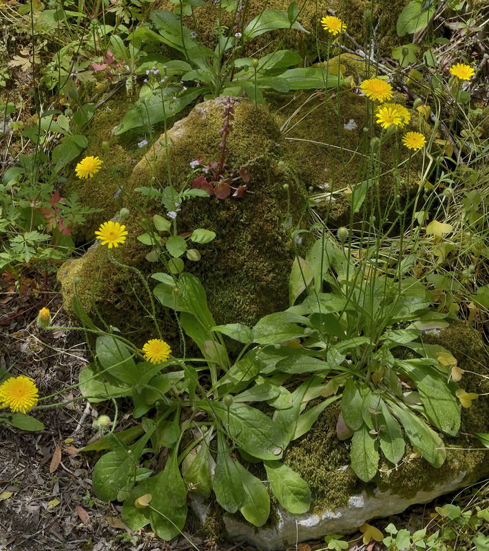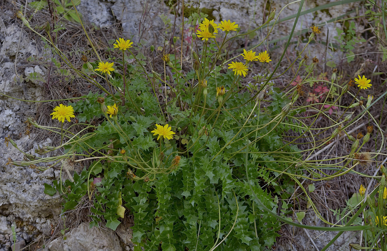 A primeira delas, Hyoseris radiata, é uma herbácea perene que coloniza fendas de rochas calcárias. As folhas com lóbulos imbricados fazem lembrar as dos dentes-de-leão (género Taraxacum), mas são mais estreitas e compridas, e com maior número de divisões. Os capítulos, um por cada haste, são pequenos, e os aquénios (frutos), ao contrário dos do dente-de-leão, não exibem aquela plumagem farta que permitia às crianças de outrora averiguar com um sopro se o pai da coleguinha era ou não careca.