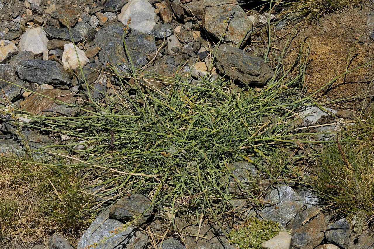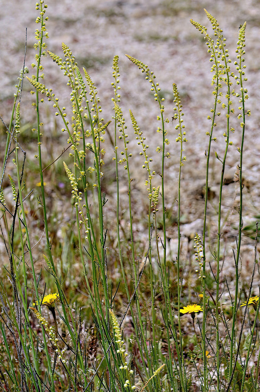 A segunda reseda endémica da Península Ibérica, R. complicata, tem uma área de distribuição bem mais restrita: ocorre apenas na serra Nevada (no topo da qual a fotografámos), em altitudes superiores a 2000 metros. Se abstrairmos do hábito prostrado que a planta exibe nas fotos (efeito dos ventos agrestes que sopram àquelas altitudes, não observado em exemplares de sítios abrigados), ela não parece diferir muito da R. virgata. É por isso instrutivo apontarmos-lhe certas diferenças substanciais: as folhas da R. complicata são mais largas e curtas do que as da R. virgata, e têm no máximo dois pares de dentes brancos na base, também eles curtos; as flores da R. complicata são quase sésseis, encostadas à haste floral, enquanto que as da R. virgata têm pedúnculos bem salientes; a R. complicata é profusamente ramificada desde a base, e é o seu aspecto emaranhado que explica o epíteto complicata.