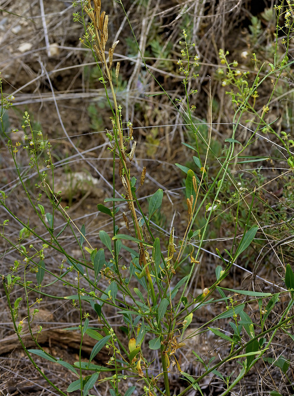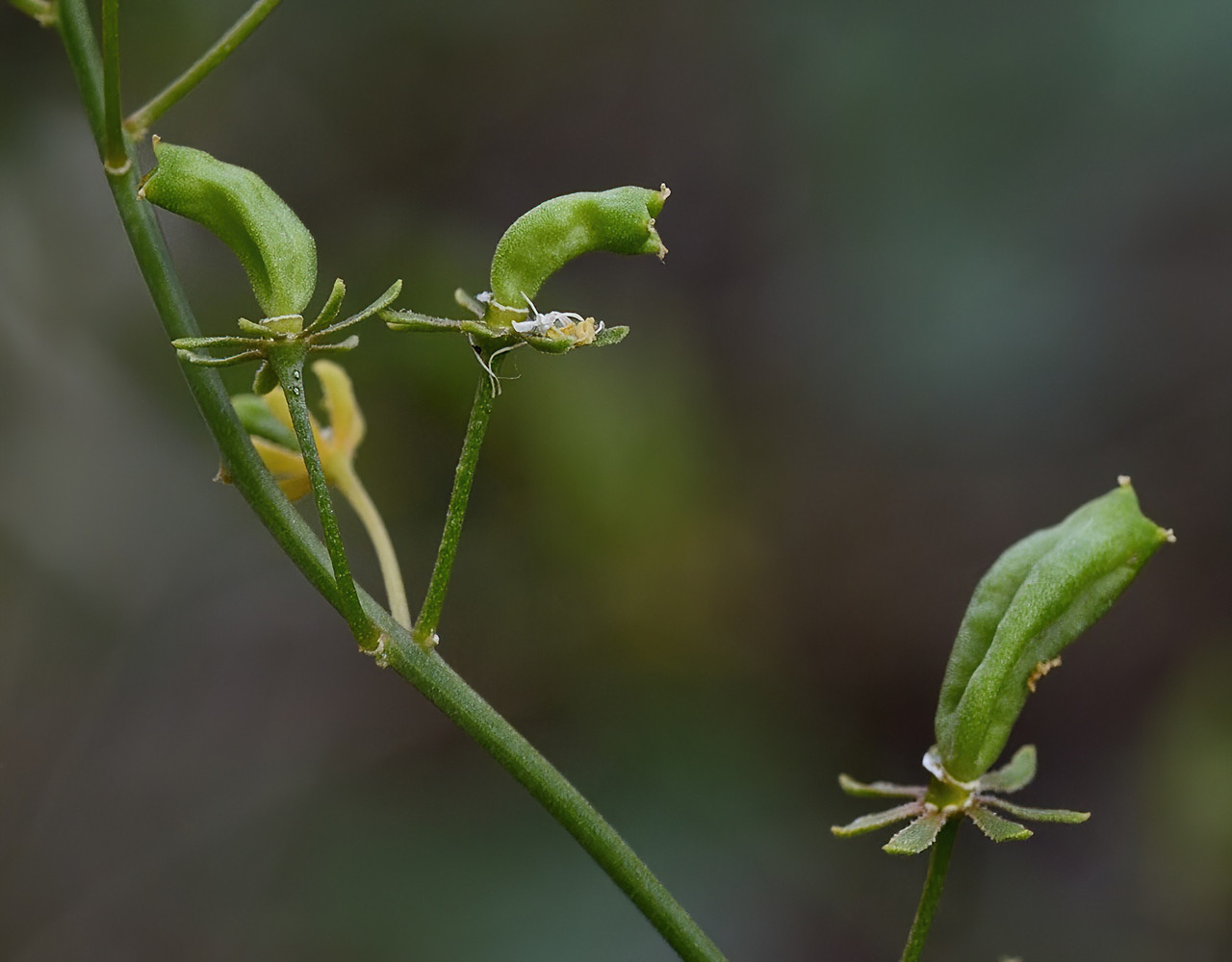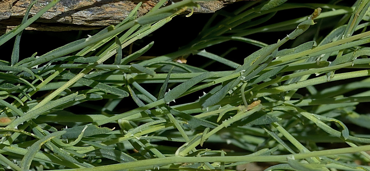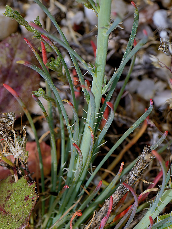 Tanto em Espanha como em Marrocos, a R. lanceolata é uma apreciadora de sol que vive em lugares secos e expostos, por isso não espanta que seja fácil de encontrar no deserto de Tabernas. Não foi lá, mas mais a leste, no vale do rio Dúrcal (provincia de Granada), que com ela deparámos pela primeira vez. Apesar de ser uma planta anual ou bienal escassamente ramificada, tem um aspecto robusto, quase arbustivo. As suas folhas parecem simples, mas considera-se que são trifoliadas: os dois folíolos laterais, por vezes ausentes, são muito menores do que o folíolo central. Os frutos apresentam-se acentuadamente curvados.